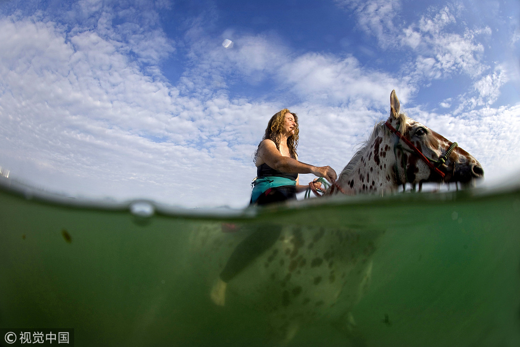 2018年7月24日讯(具体拍摄时间不详),英国康沃尔郡,游客在芒茨海湾体验骑马入海游泳。