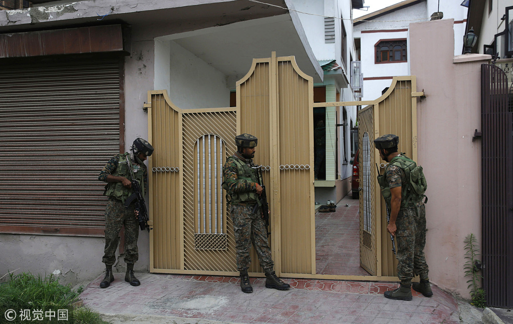 当地时间2018年7月24日,印控克什米尔斯利那加,准军事部队士兵在站岗。印度警方发言人说,武装分子向23营的中央后备警察部队开枪,一名警员伤势过重不幸身亡。