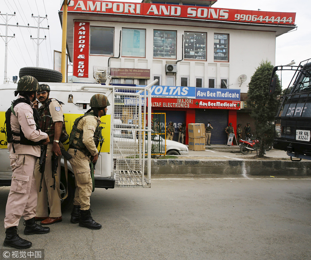 当地时间2018年7月24日,印控克什米尔斯利那加,准军事部队士兵在站岗。印度警方发言人说,武装分子向23营的中央后备警察部队开枪,一名警员伤势过重不幸身亡。