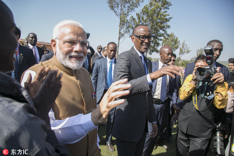 当地时间2018年7月24日,卢旺达姆韦鲁,印度总理莫迪访问卢旺达,向卢旺达赠送200头奶牛作为礼物,以支持卢旺达总统卡加梅的减少贫困和儿童营养不良的倡议。