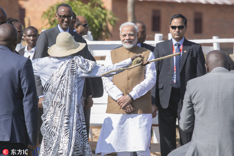 当地时间2018年7月24日,卢旺达姆韦鲁,印度总理莫迪访问卢旺达,向卢旺达赠送200头奶牛作为礼物,以支持卢旺达总统卡加梅的减少贫困和儿童营养不良的倡议。