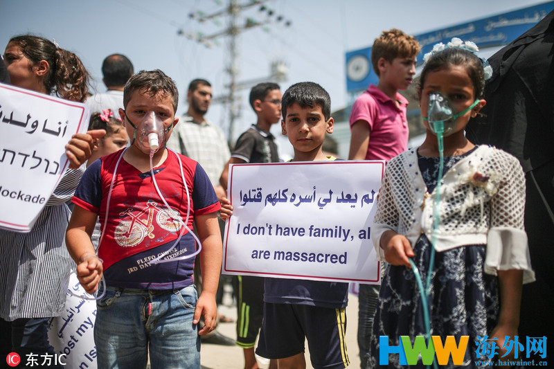 加沙儿童参加集会 戴氧气罩抗议以方封锁