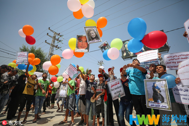 当地时间2018年7月24日,加沙城,加沙儿童参加集会,抗议以色列针对巴勒斯坦的封锁。图片来源:东方IC