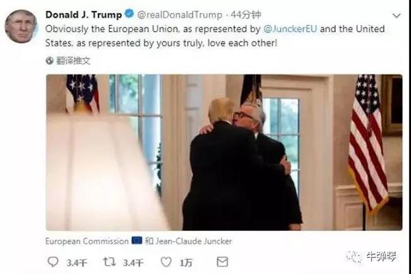 他夸耀和欧盟委员会主席容克的会晤“很温馨”。他还在推特上贴了一张与容克“贴面礼”的照片,并这样说:“显而易见,容克所代表的欧盟及你们代表的美国,真的爱对方!”