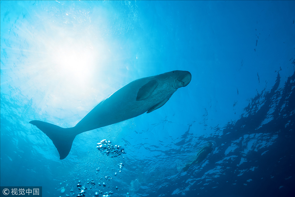 2018年7月26日讯(具体拍摄时间地点不详),一头体型庞大的儒艮在海中畅游。因雌性儒艮有怀抱幼崽到水面哺乳的习惯,还时常在头上披着海草,故儒艮常被误认为“美人鱼”。