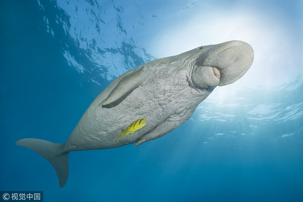 2018年7月26日讯(具体拍摄时间地点不详),一头体型庞大的儒艮在海中畅游。因雌性儒艮有怀抱幼崽到水面哺乳的习惯,还时常在头上披着海草,故儒艮常被误认为“美人鱼”。