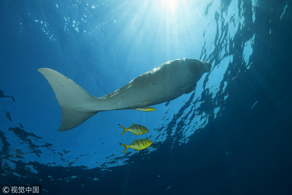 2018年7月26日讯(具体拍摄时间地点不详),一头体型庞大的儒艮在海中畅游。因雌性儒艮有怀抱幼崽到水面哺乳的习惯,还时常在头上披着海草,故儒艮常被误认为“美人鱼”。