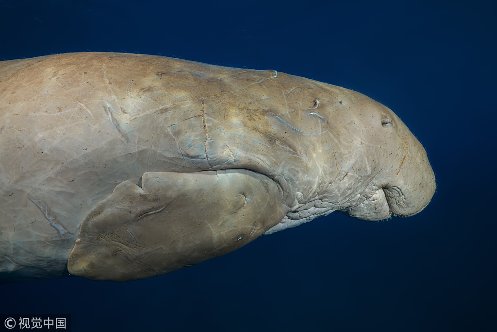 2018年7月26日讯(具体拍摄时间地点不详),一头体型庞大的儒艮在海中畅游。因雌性儒艮有怀抱幼崽到水面哺乳的习惯,还时常在头上披着海草,故儒艮常被误认为“美人鱼”。