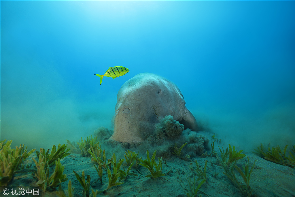 2018年7月26日讯(具体拍摄时间地点不详),一头体型庞大的儒艮在海中畅游。因雌性儒艮有怀抱幼崽到水面哺乳的习惯,还时常在头上披着海草,故儒艮常被误认为“美人鱼”。