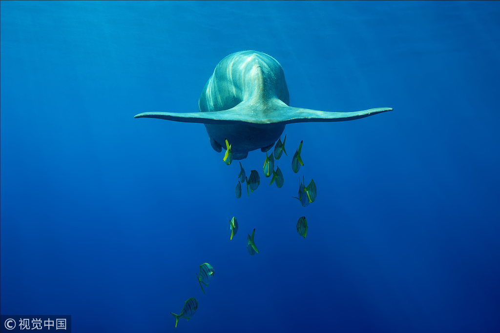 2018年7月26日讯(具体拍摄时间地点不详),一头体型庞大的儒艮在海中畅游。因雌性儒艮有怀抱幼崽到水面哺乳的习惯,还时常在头上披着海草,故儒艮常被误认为“美人鱼”。