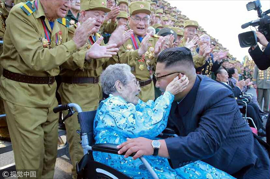2018年7月27日讯,7月27日是朝鲜祖国解放战争胜利65周年。据朝中社27日报道,朝鲜最高领导人金正恩近日奔赴祖国解放战争参战烈士墓凭吊,还同第5次全国参战老兵大会与会者会晤并合影留念。图片来源:视觉中国。