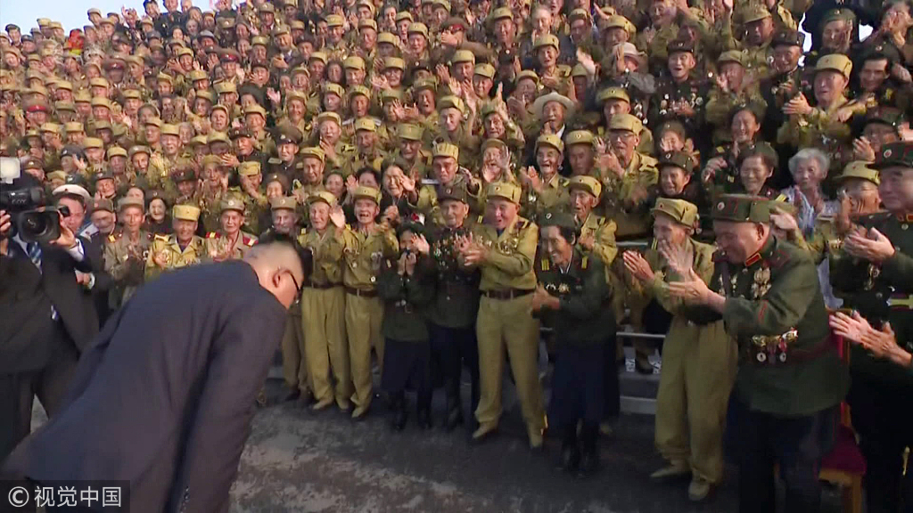 2018年7月27日讯,7月27日是朝鲜祖国解放战争胜利65周年。据朝中社27日报道,朝鲜最高领导人金正恩近日奔赴祖国解放战争参战烈士墓凭吊,还同第5次全国参战老兵大会与会者会晤并合影留念。图片来源:视觉中国。
