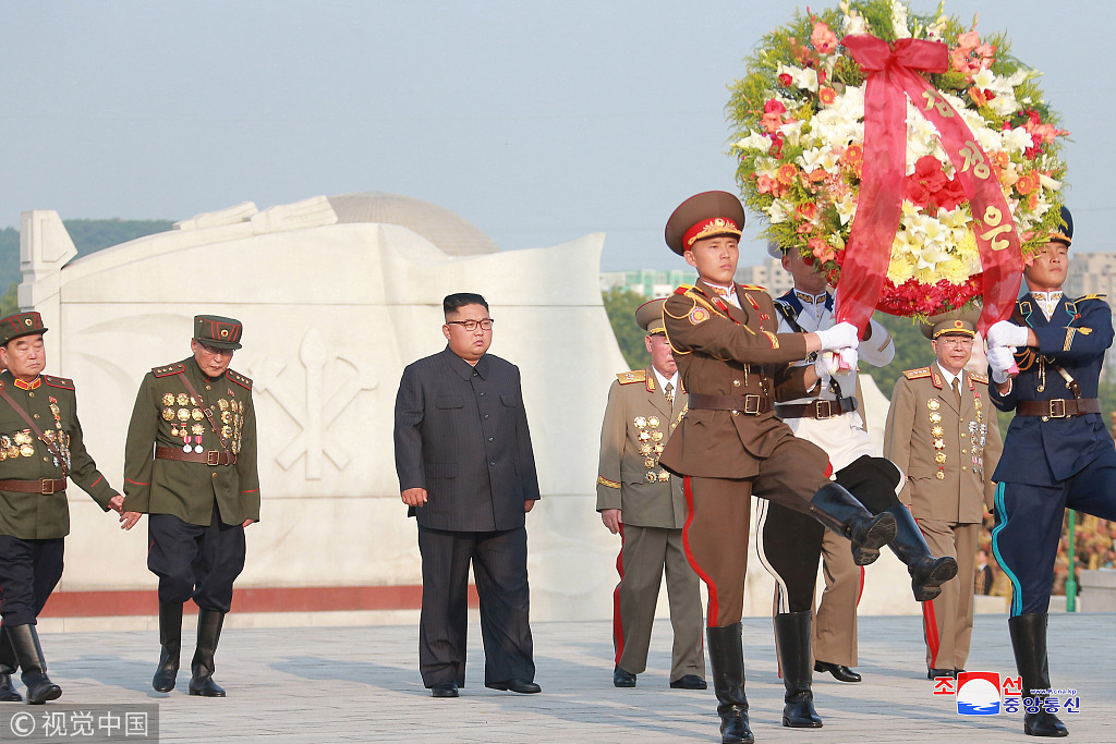 2018年7月27日讯,7月27日是朝鲜祖国解放战争胜利65周年。据朝中社27日报道,朝鲜最高领导人金正恩近日奔赴祖国解放战争参战烈士墓凭吊,还同第5次全国参战老兵大会与会者会晤并合影留念。图片来源:视觉中国。