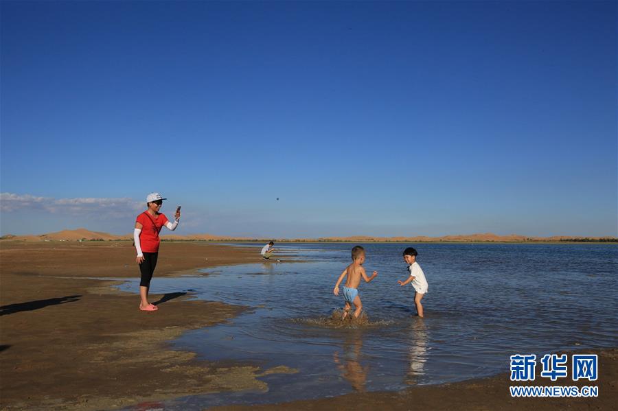 7月25日,几名游客在库布其沙漠七星湖景区戏水。 随着暑期旅游旺季的来临,位于内蒙古库布其沙漠的响沙湾、七星湖等景区迎来了来自全国各地的游客。人们在沙漠中体验索道、骑行、冲浪车等旅游项目,领略大漠壮美景观。 新华社记者 卢烨 摄