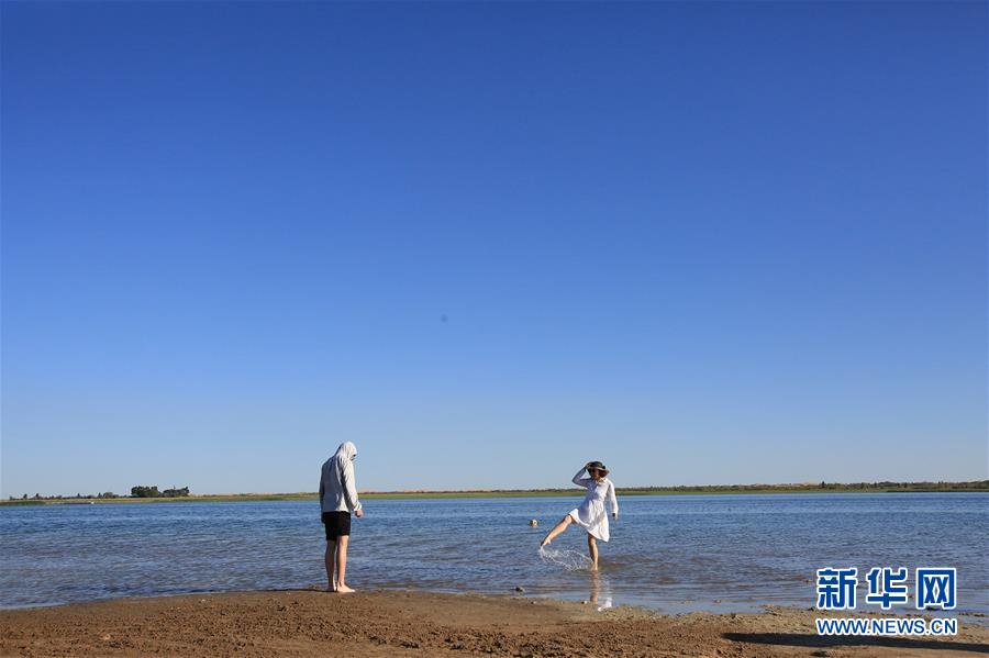 7月25日,两名游客在库布其沙漠七星湖景区戏水。 随着暑期旅游旺季的来临,位于内蒙古库布其沙漠的响沙湾、七星湖等景区迎来了来自全国各地的游客。人们在沙漠中体验索道、骑行、冲浪车等旅游项目,领略大漠壮美景观。 新华社记者 卢烨 摄