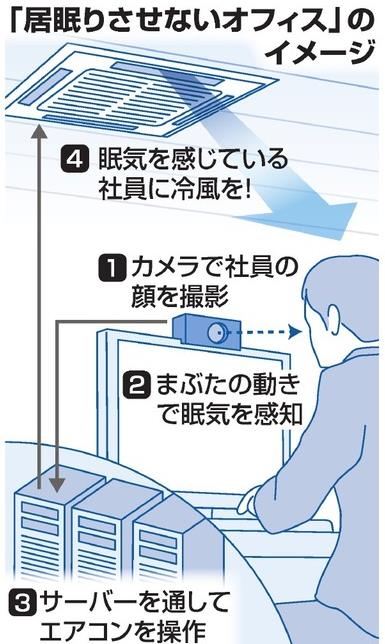 简单来说就是,摄像头的“眼皮动态捕捉”系统运用了NEC擅长的人脸识别技术,通过人工智能对人的眼皮进行分析判断员工的倦意。大金公司则负责开发控制空调的技术,让空调的风准确吹向产生倦意的员工。