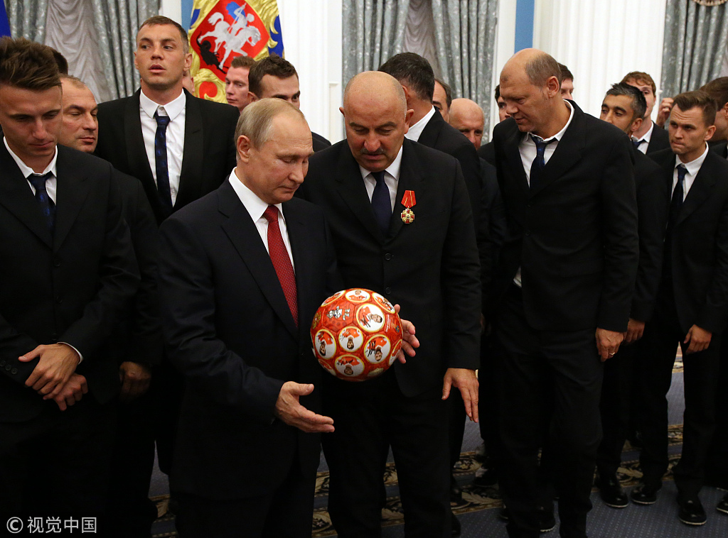 俄罗斯总统普京接见足球国家队并为其颁奖