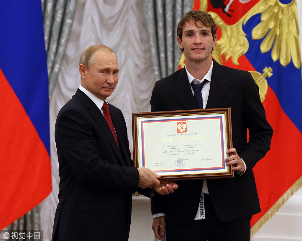 俄罗斯总统普京接见足球国家队并为其颁奖
