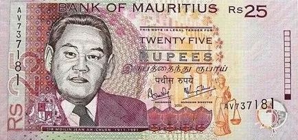 △毛里求斯面值25卢比的纸币,印着另一位华人朱梅麟的头像。祖籍广东梅州的朱梅麟是毛里求斯第一个进入立法会的华人。