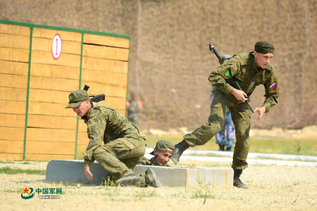 笔者在现场看到,交通壕、混凝土墙、铁丝网、斜梯等障碍物布满了整个赛场。中方裁判员陈升上校介绍说,赛程总长为1200米,设置19个障碍物,分为600 米的障碍区和600米的冲刺区,每名参赛队员按规定路线完成越障和冲刺等竞赛内容,旨在检验单个军人及全班协同越障技能,具有很强的实战性。