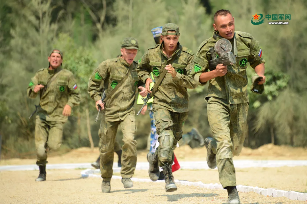 俄罗斯(左)和伊朗(右)参赛队员向障碍物同时发起冲击。闫培 摄