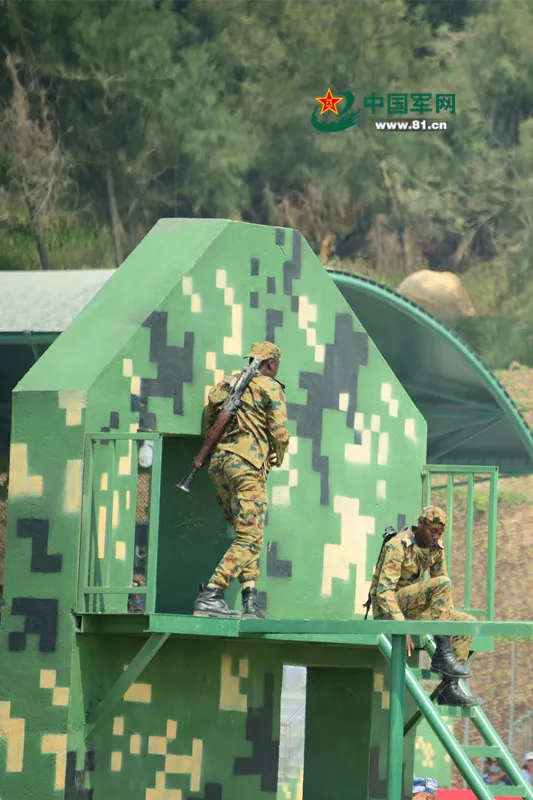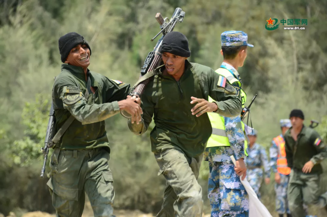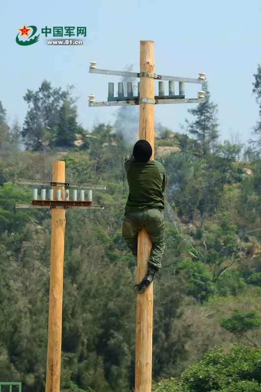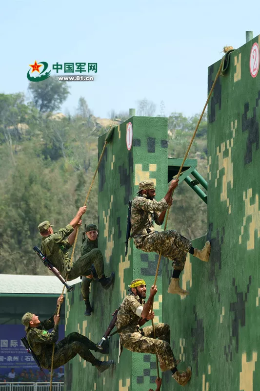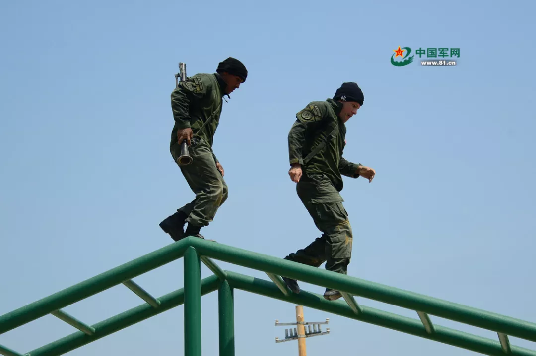 委内瑞拉参赛队员拉发通信线杆上的信号弹,顺利通过此处障碍物。闫培 摄