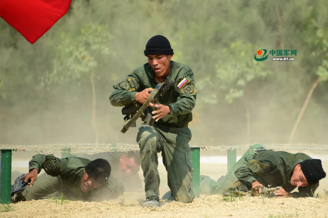 委内瑞拉参赛队员通过低桩铁丝网障碍物。闫培 摄
