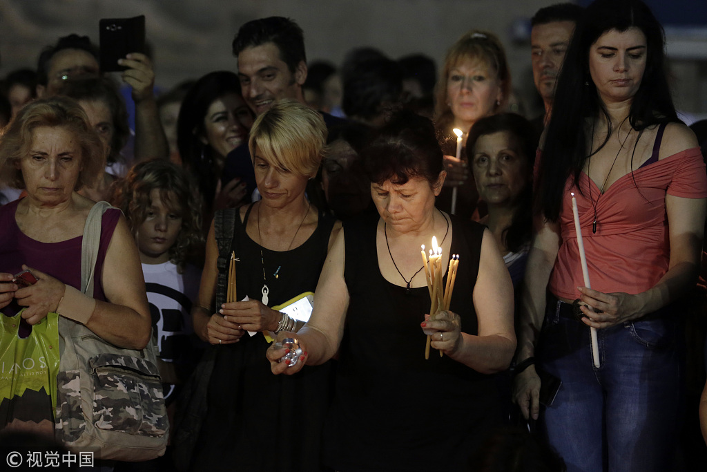 当地时间2018年7月30日,希腊雅典,民众在希腊议会外点燃蜡烛,纪念森林大火的遇难者。希腊雅典东部沿海地区发生了近一个多世纪以来欧洲最为致命的一场森林火灾,据希腊消防部门的最新数据显示,此次的山火已经导致91人死亡,另有25人失踪。