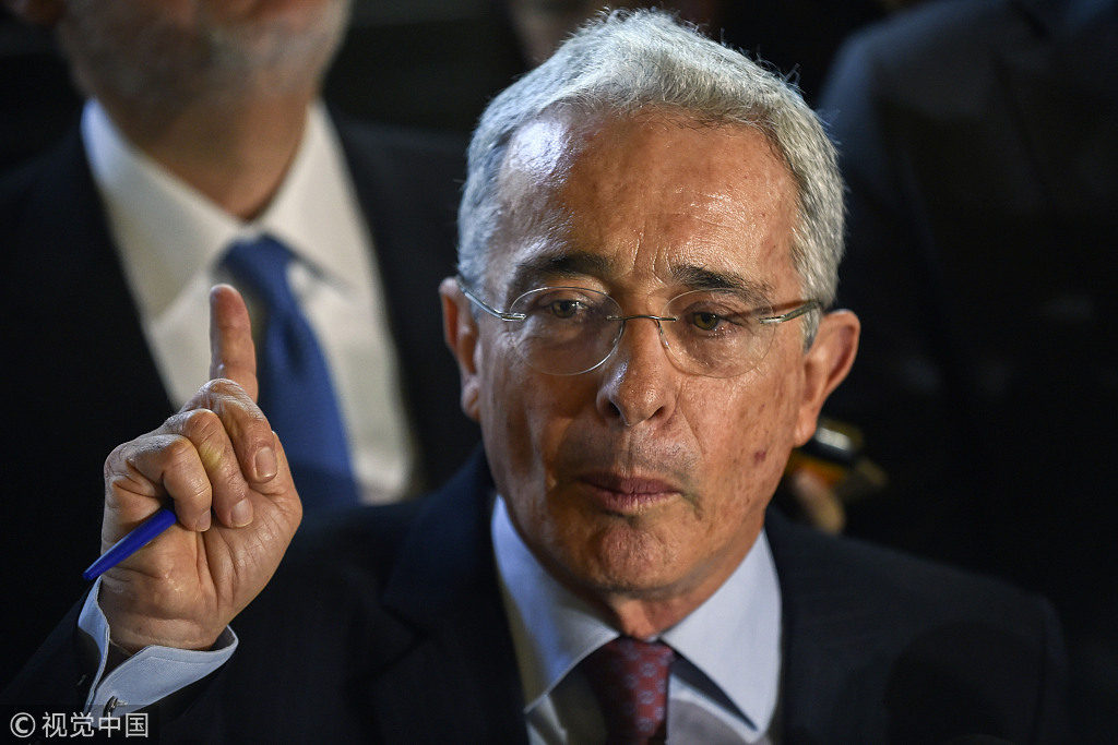 当地时间2018年7月30日,哥伦比亚里奥内格罗,哥伦比亚前总统阿尔瓦罗·乌里韦·贝莱斯对记者讲话。