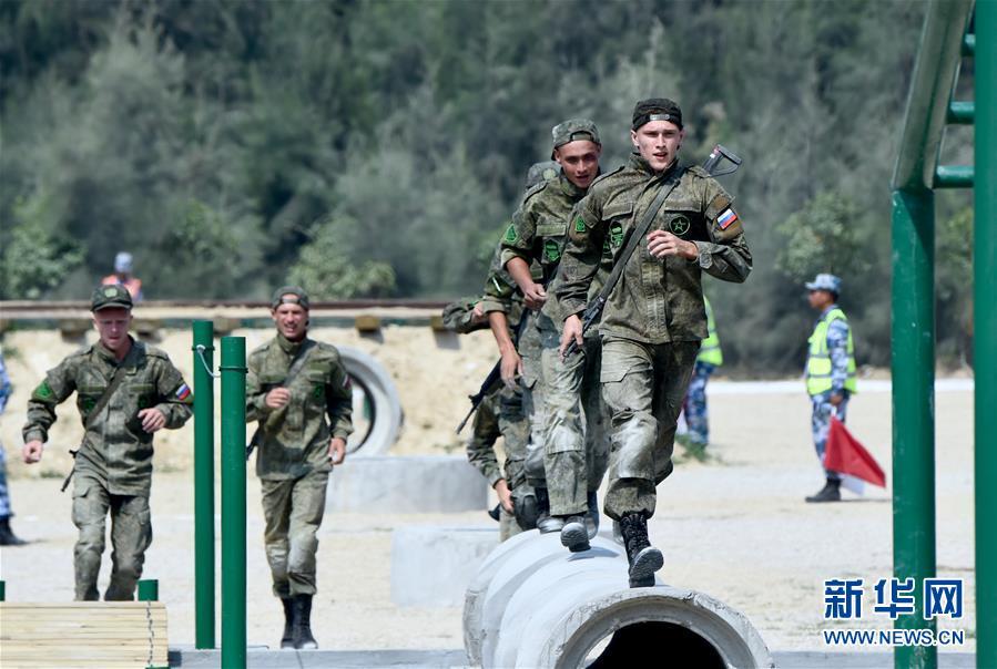 7月30日,俄罗斯参赛队员参加“国际军事比赛-2018”海上登陆赛障碍赛。 泉州石狮将军山脚下,不同语言的加油声此起彼伏。近40摄氏度的高温下,来自中国、俄罗斯、伊朗、委内瑞拉、苏丹5国的海上精英30日展开了海上登陆赛第一阶段障碍赛的激烈角逐。中国代表队3个陆战班以7分51秒、7分58秒、8分35秒,包揽障碍赛前3名。 新华社记者 姜克红 摄