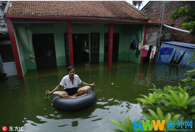越南河内遭洪水袭击 民众出行靠划船