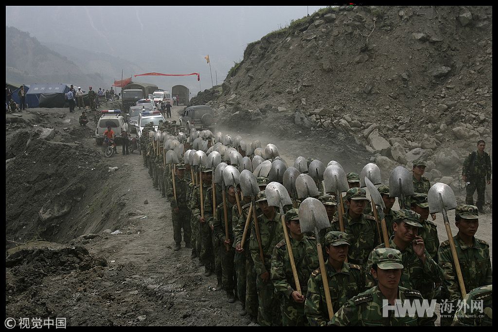 2008年5月25日,都江堰去映秀的路上。解放军某部援救队,