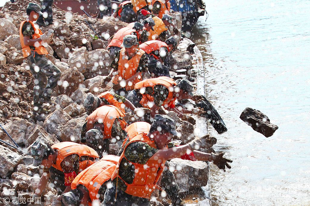 2010年7月19日,受长江水位影响,彭泽县棉船镇金星村9组大堤出现崩岸险情,政府紧急调用数艘民船,拖运410立方米石块,驻扎当地400余名解放军官兵上船抛石,护堤固坝.抛石护堤水花四溅。