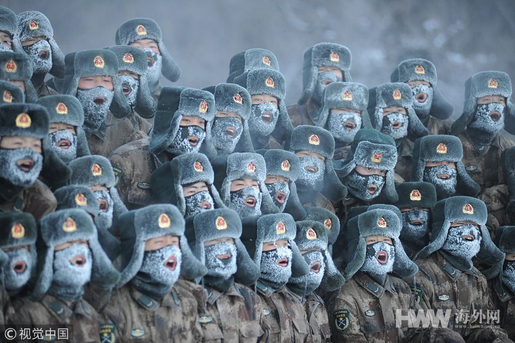 2011年1月21日,解放军驻黑龙江省伊春市某部新兵营150多名新兵在零下32摄氏度的严寒中进行了站军姿、列队、越野跑等基础野外训练,在冰天雪地里磨练意志。+++_+++野外训练,新兵,伊春,新兵,严寒,寒冷,训练,军人,