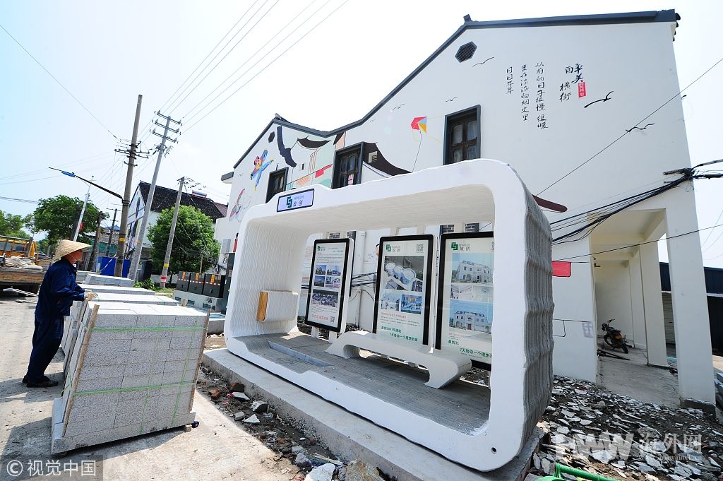 2018年7月31日,两座简洁大方,设计造型充满现代科技气息的3D打印公交站台亮相浙江省湖州市南浔区横街村。