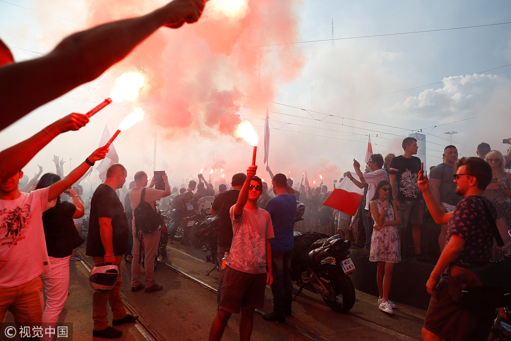 当地时间2018年8月1日,波兰华沙,波兰民众在广场上点燃冷焰火纪念波兰起义74周年。
