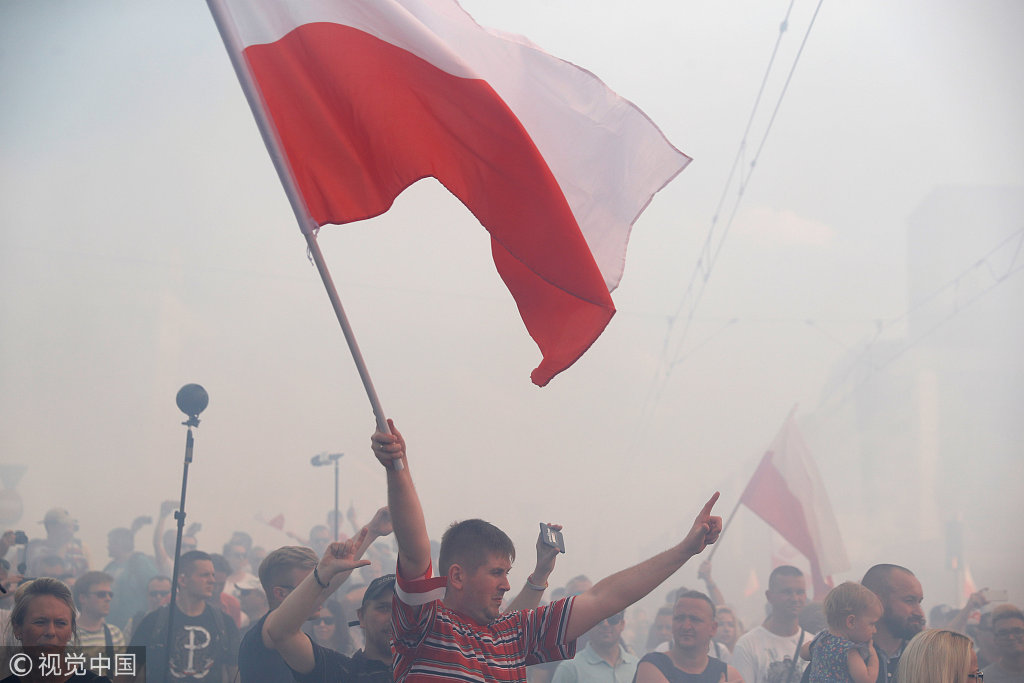 当地时间2018年8月1日,波兰华沙,波兰民众在广场上点燃冷焰火纪念波兰起义74周年。