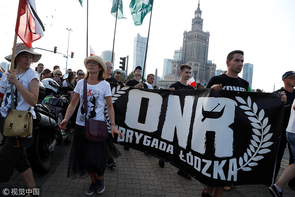 波兰举行活动纪念华沙起义74周年 民众广场集会燃放冷焰火