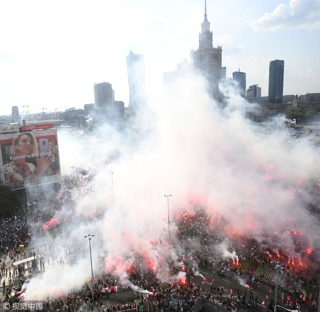 当地时间2018年8月1日,波兰华沙,波兰民众在广场上点燃冷焰火纪念波兰起义74周年。