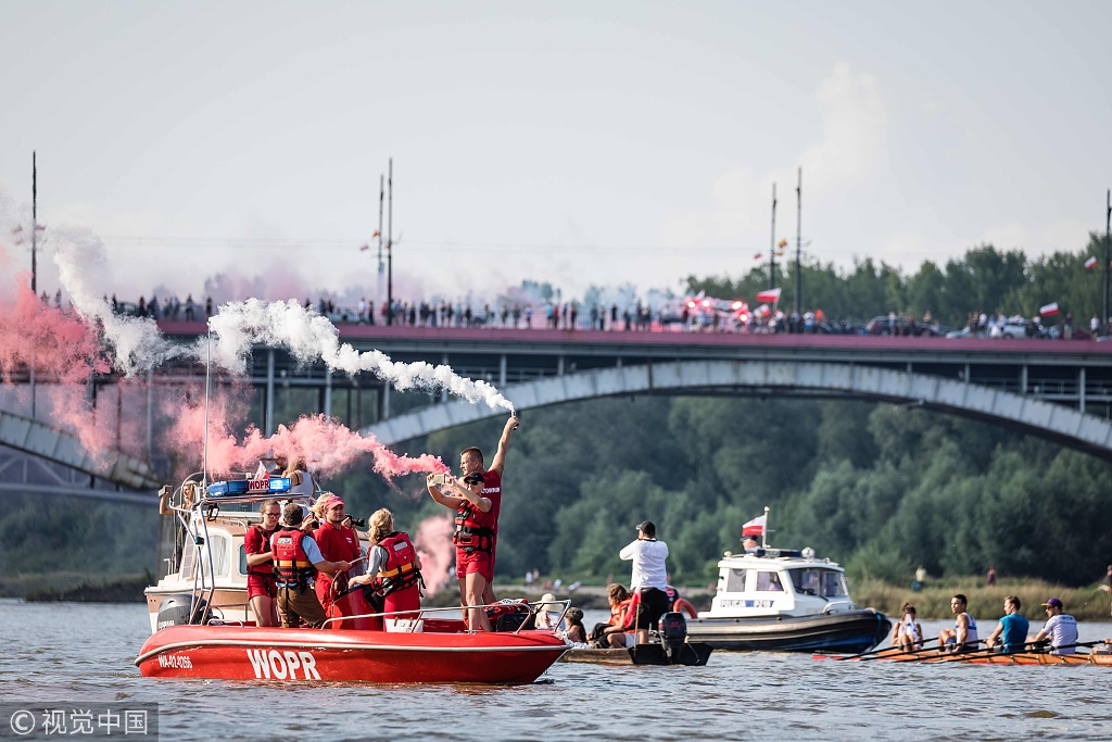 当地时间2018年8月1日,波兰华沙,波兰民众在广场上点燃冷焰火纪念波兰起义74周年。