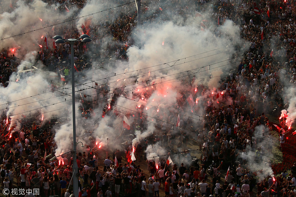 当地时间2018年8月1日,波兰华沙,波兰民众在广场上点燃冷焰火纪念波兰起义74周年。