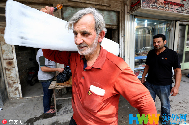 当地时间2017年7月6日,伊拉克巴格达,随着夏季气温的不断升高,居民购买冰块来降温。在伊拉克,因为时常会发生断电情况,夏季高温又常常飙升50多度,所以使用冰块来消暑降温广受民众欢迎。