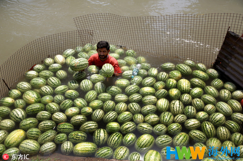 当地时间2018年5月28日,印控克什米尔,印度小贩售卖泡在水中的西瓜。印度气象局发布预警称印度北部地区未来数将遭热浪袭击,与此同时克什米尔地区的气温已超过了44摄氏度。