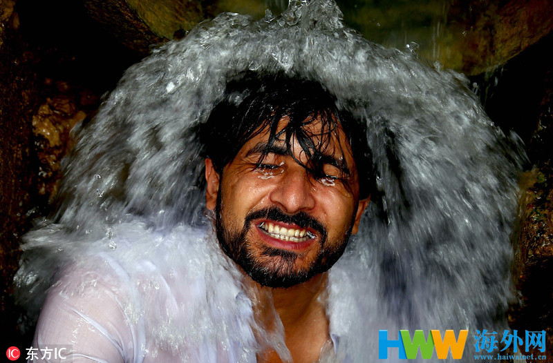 当地时间2018年5月29日,巴基斯坦卡拉奇,当地连续数日遭受热浪侵袭,室外最高气温一度高达摄氏44度。据媒体报道,热浪已经导致超过60人死亡。图为一名男子在水管下冲凉。