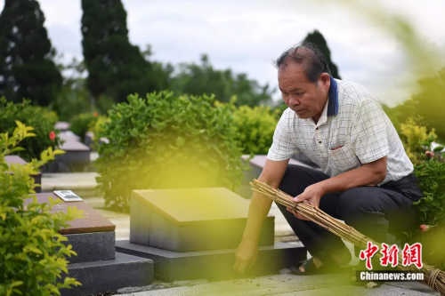 钮本同清理墓园的杂草。俞靖 摄