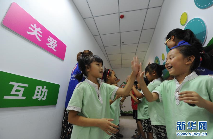 8月3日,在山东省滨州市沾化区富源街道儿童驿站,志愿者与孩子们玩游戏。暑假期间,山东省滨州市沾化区富源街道为留守儿童成立了儿童驿站,由社区青年志愿者轮流为留守儿童辅导作业,与孩子们做游戏,让孩子们欢度暑假。 新华社发(刘玉和 摄)