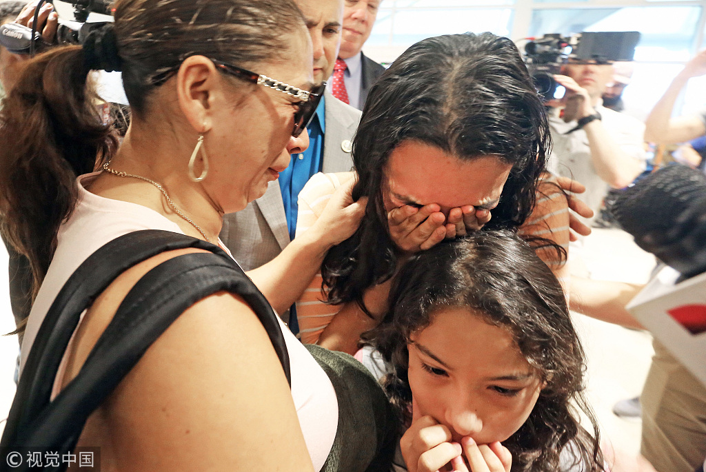 当地时间2018年8月3日,美国奥兰多,由于特朗普政府收紧移民政策,在达文波特居住多年的Alejandra Juarez被遣返回墨西哥,在机场与女儿道别。图片来源:视觉中国