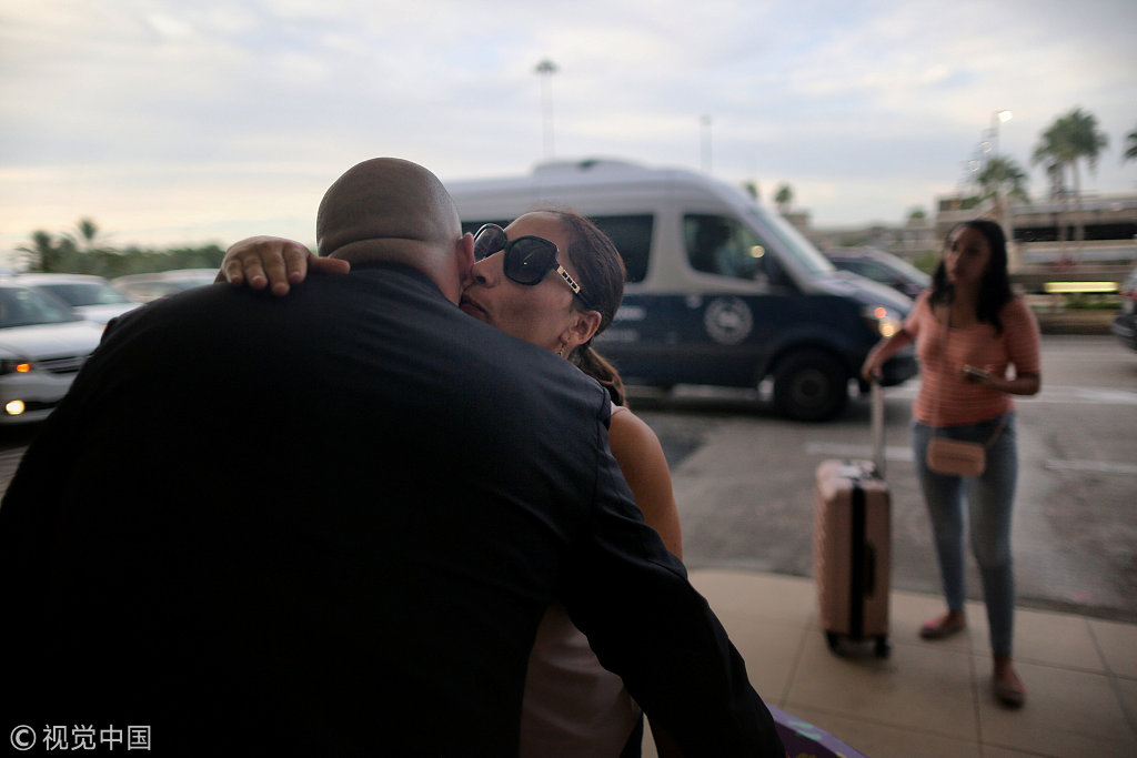 当地时间2018年8月3日,美国奥兰多,由于特朗普政府收紧移民政策,在达文波特居住多年的Alejandra Juarez被遣返回墨西哥,在机场与女儿道别。图片来源:视觉中国