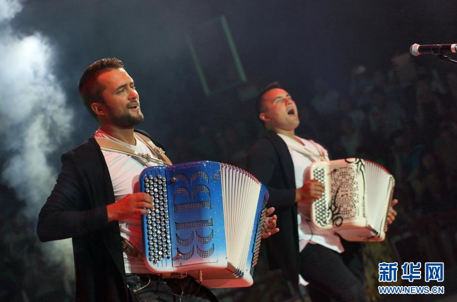 8月3日晚,俄罗斯流行手风琴组合“Bayan Mix”在蓬莱市欧乐堡大马戏剧院演奏手风琴。 新华社发(唐克 摄)