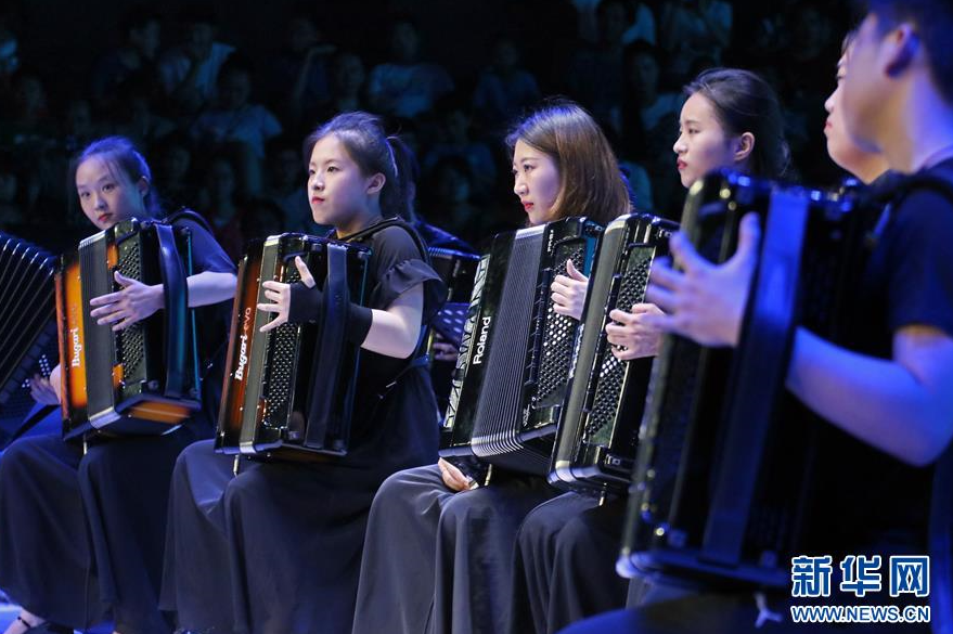8月3日晚,天津音乐学院星空电子交响乐团在蓬莱市欧乐堡大马戏剧院演奏手风琴。8月3日,2018“鹦鹉杯”国际手风琴艺术周在山东省蓬莱市开幕,艺术周期间将举办手风琴音乐会、手风琴比赛、名师讲座等活动,吸引国内外手风琴爱好者、音乐教育工作者、音乐演出团体等2000余人参加。新华社发(唐克 摄)
